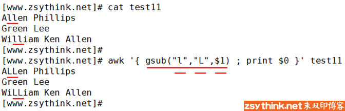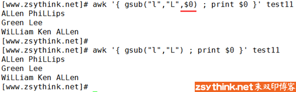 如上图所示,我们使用gsub函数,将小写字母”l”替换成大写字母”L”,但是替换的范围只限于”$1″,所以,当我们再次输出文本时,发现只有文本中的第一列中的小写字母”l”被替换成了大写字母”L”,其他列中的小写字母”l”并未被替换,当然,如果你想要替换文本中所有的小写字母”l”,则可以将上图中的”$1″换成”$0″,或者省略gsub函数中的第三个参数,省略gsub中的第三个参数时,默认为”$0″,示例如下。
