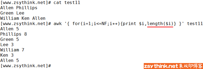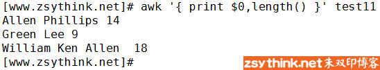 如上图所示,我们输出了文本中每个单词的长度,其实,length函数可以省略传入的参数,即不指定任何字符换,当省略参数时,默认使用”$0″作为参数,示例如下。