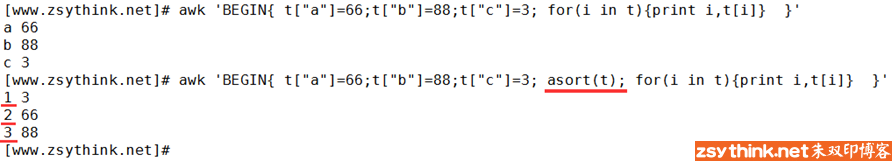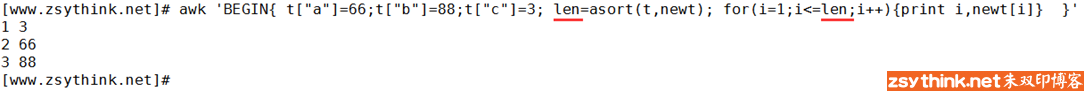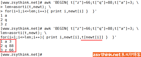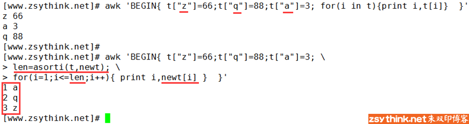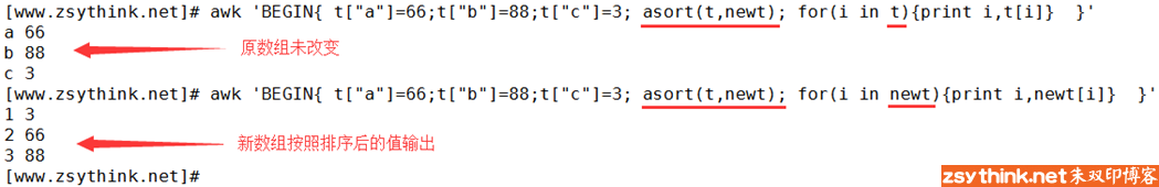 如上图所示,asorti 函数根据数组t的下标排序后,创建了一个新的数组newt,newt中元素的值即为t数组下标的值,上例中,我们使用len变量保存了asorti函数的返回值,并且输出了最后排序后的新数组。
